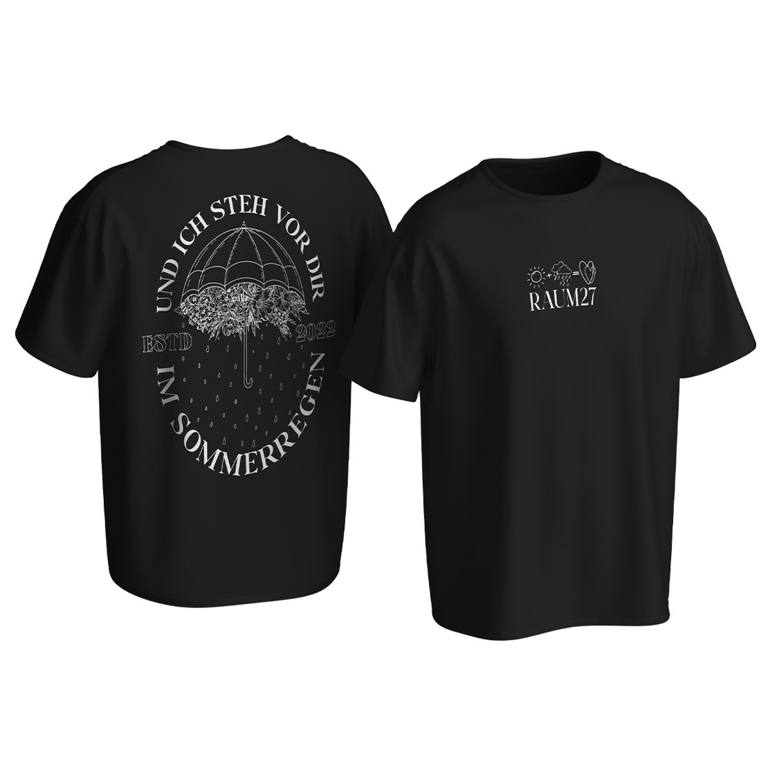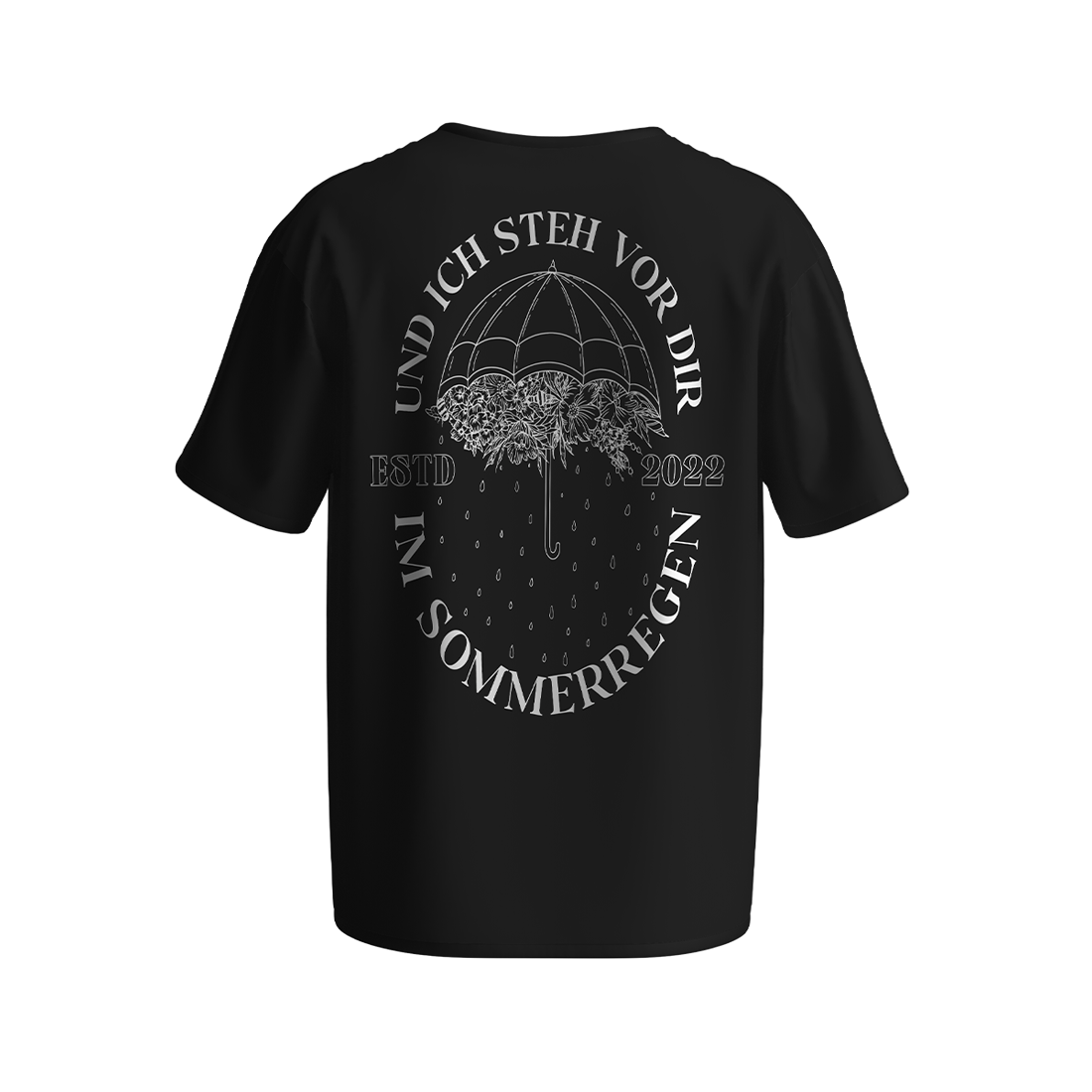 Schwarzes T-Shirt mit "SOMMERREGEN" Druck auf der Vorderseite und großem Backprint. Pflegehinweise: dem Klima zuliebe kalt waschen und an der Luft trocknen. Vor dem Waschen auf links drehen schont den Druck.