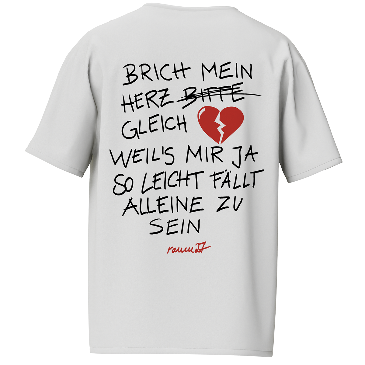 Weißes T-Shirt mit Front- und Backprint. Pflegehinweise: dem Klima zuliebe kalt waschen und an der Luft trocknen. Vor dem Waschen auf links drehen schont den Druck.