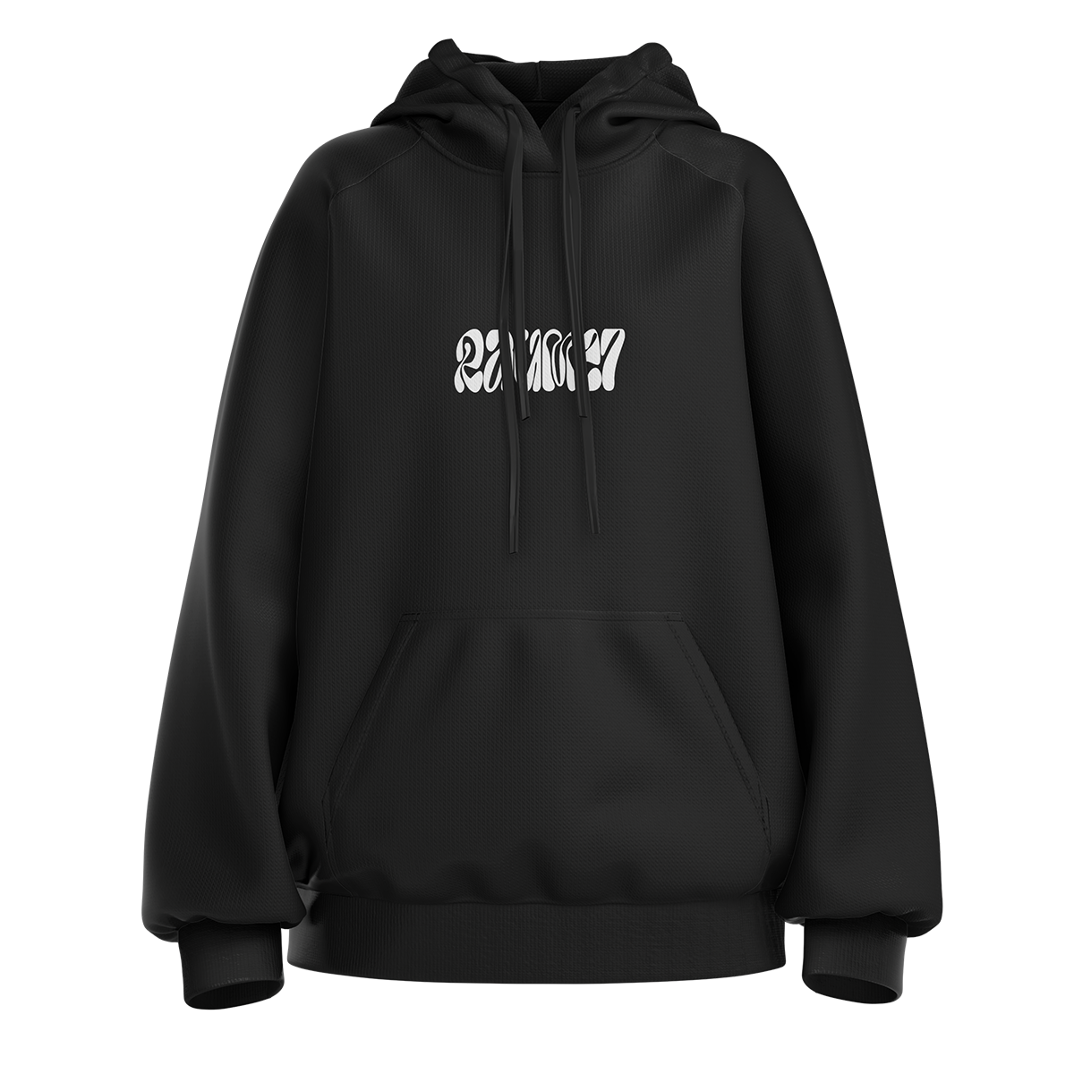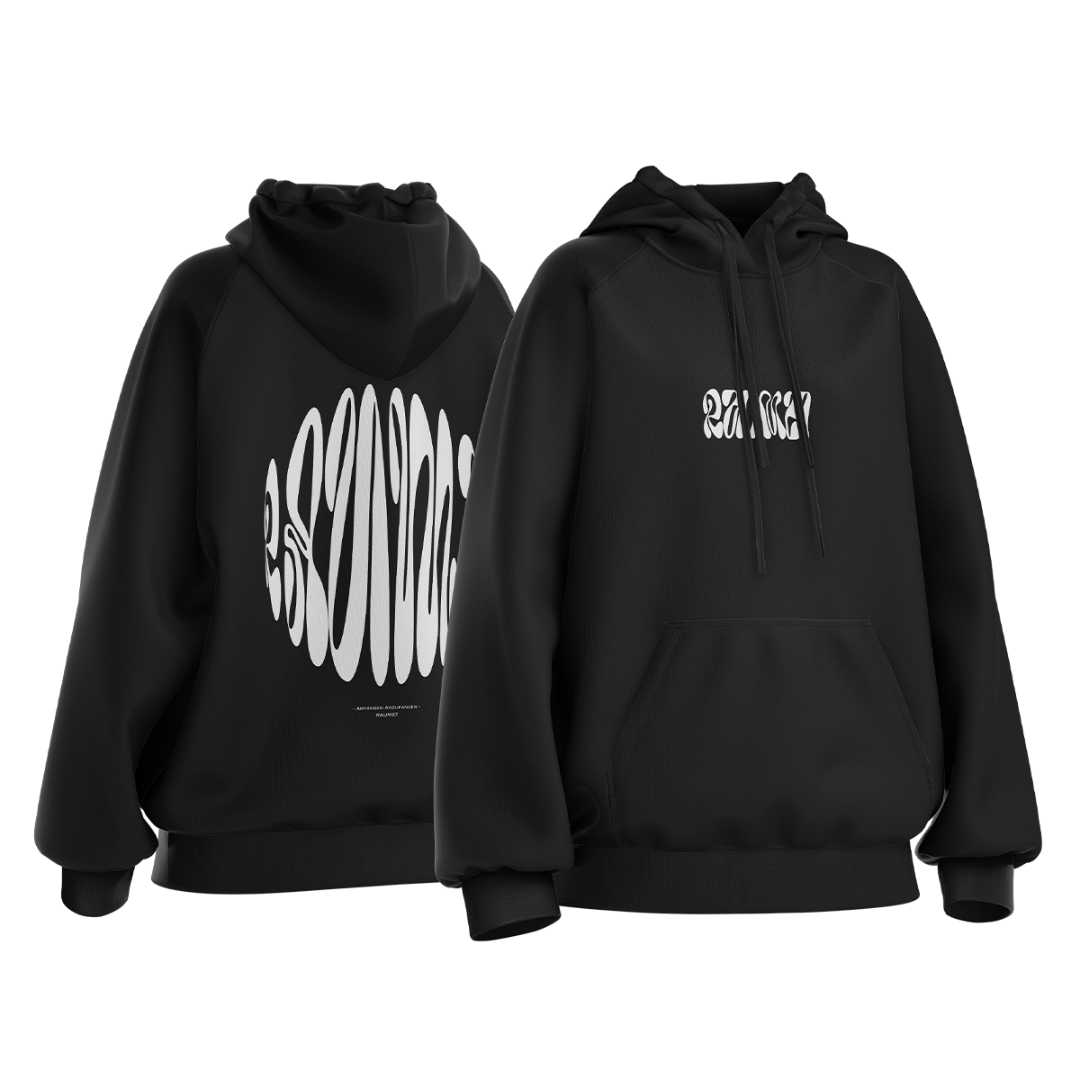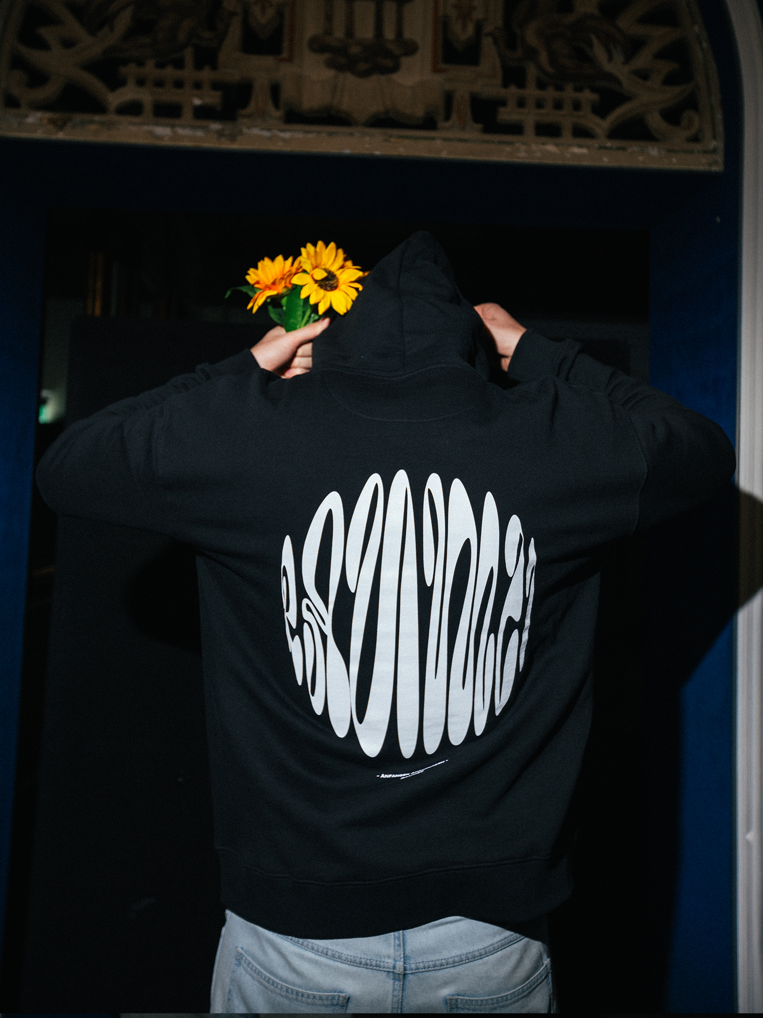 Schwarzer Hoodie mit Front- und Backprint. Pflegehinweise: dem Klima zuliebe kalt waschen und an der Luft trocknen. Vor dem Waschen auf links drehen schont den Druck.