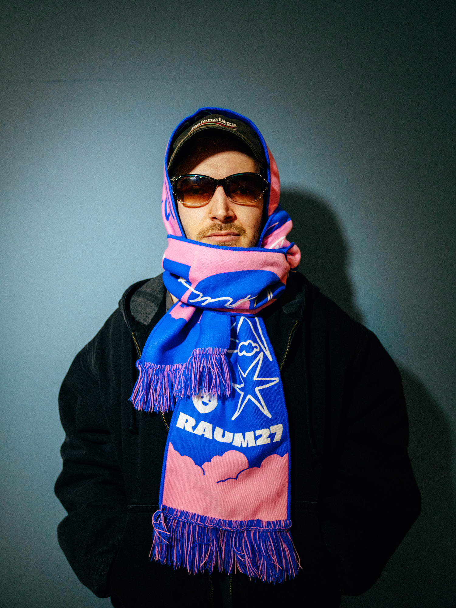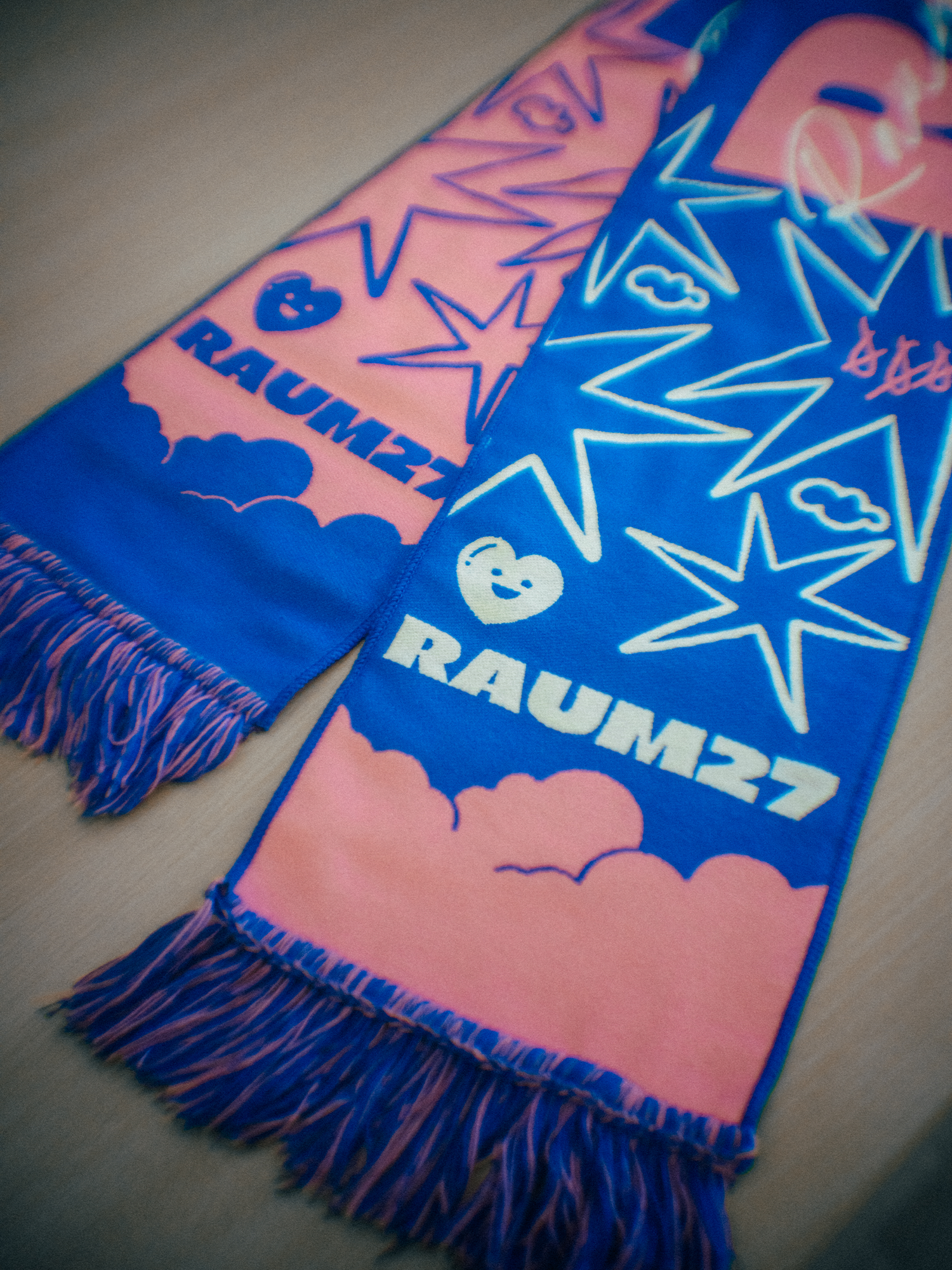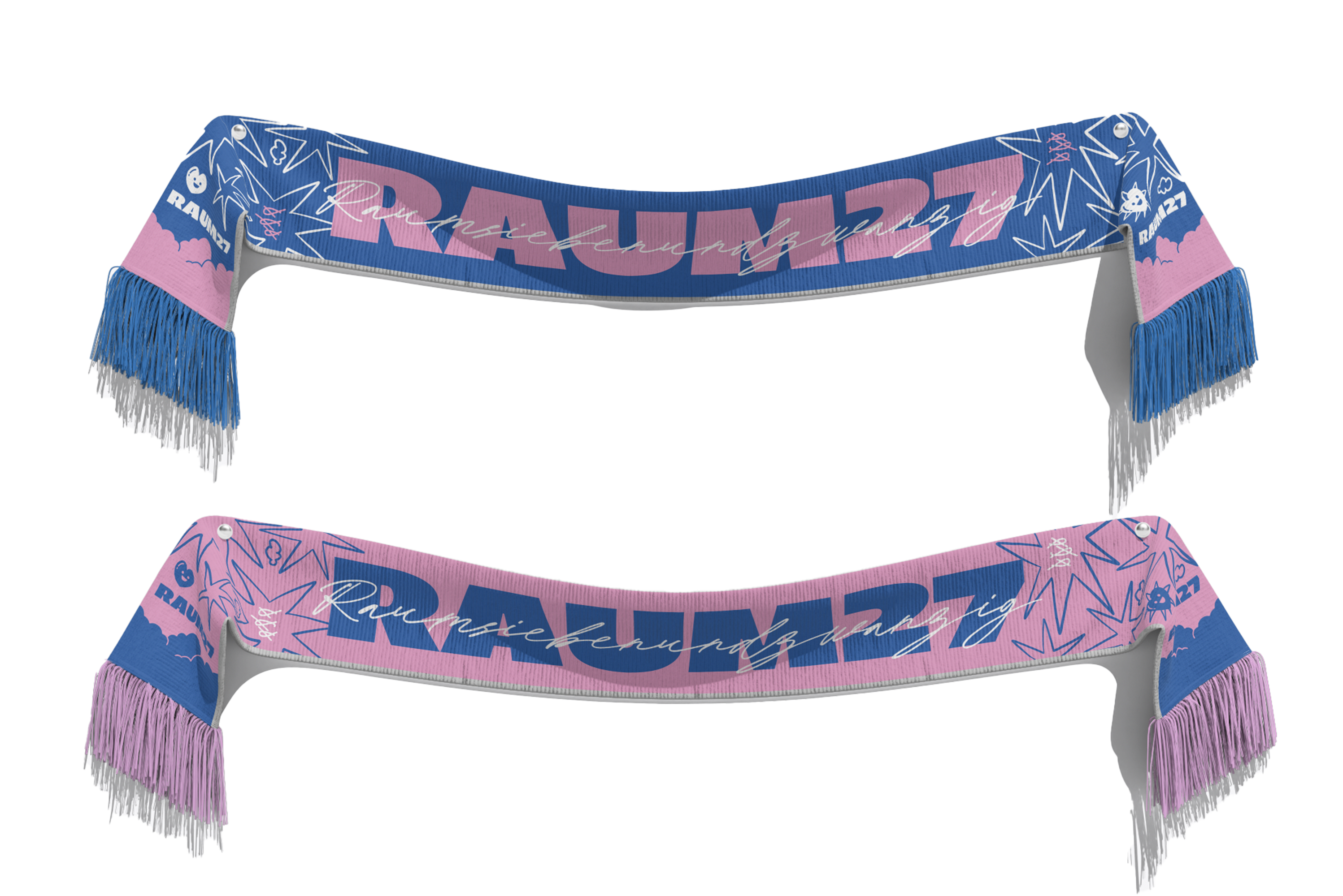 Raum27 Fanschal in frischem blau-rosa Design. Das Mock Up zeigt beide Seiten des Schals.