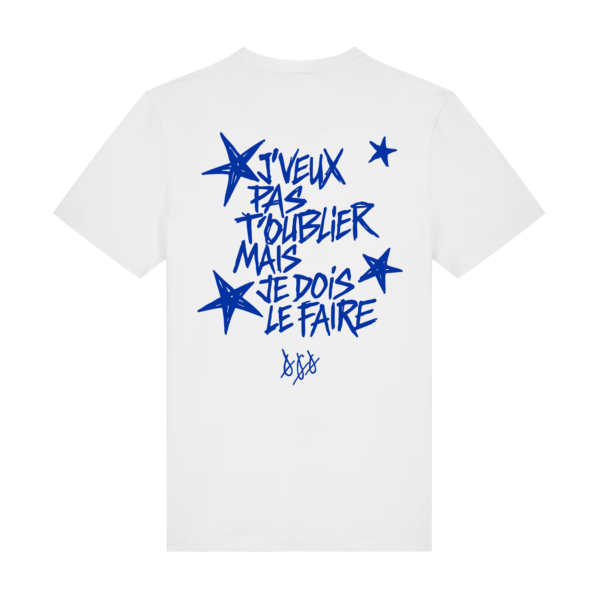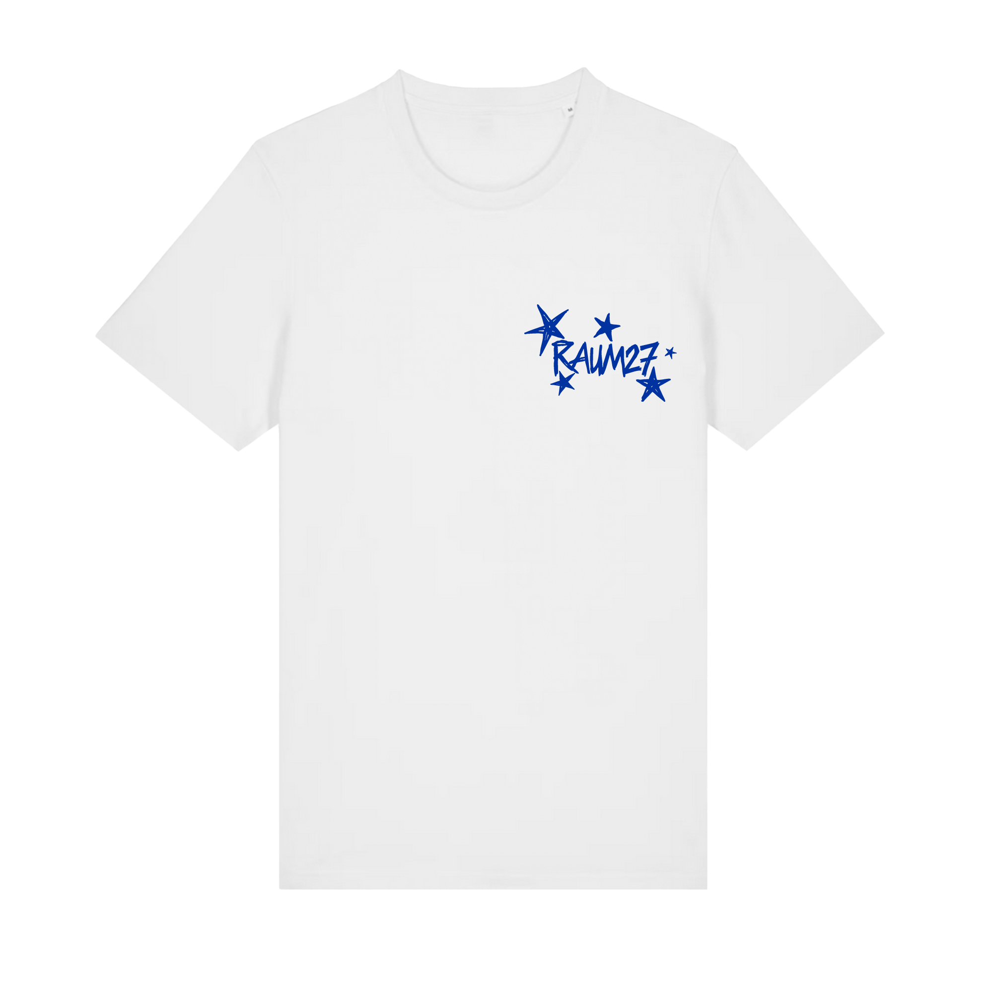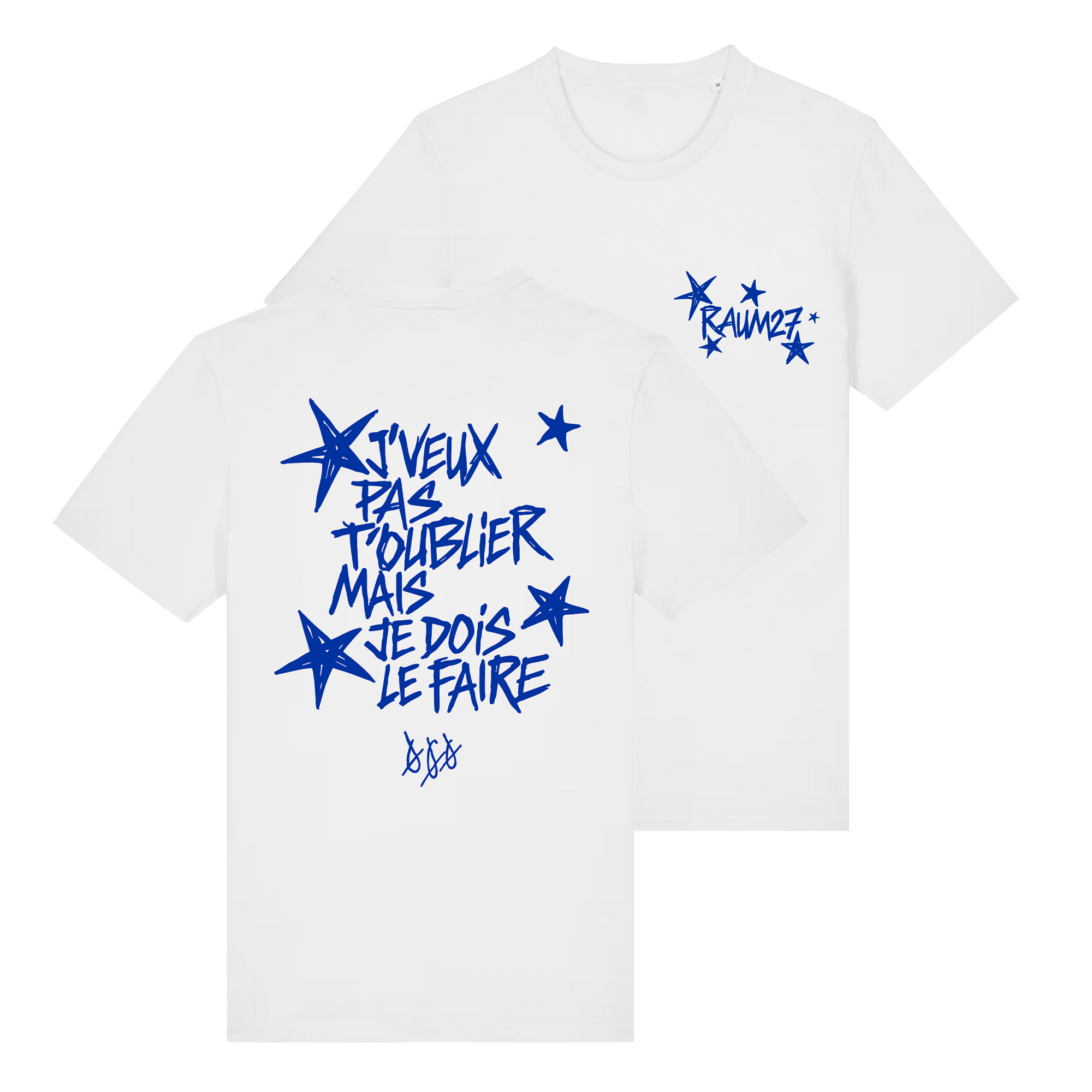 Weißes T-Shirt mit blauem Front- und Backprint. Pflegehinweise: dem Klima zuliebe kalt waschen und an der Luft trocknen. Vor dem Waschen auf links drehen schont den Druck.